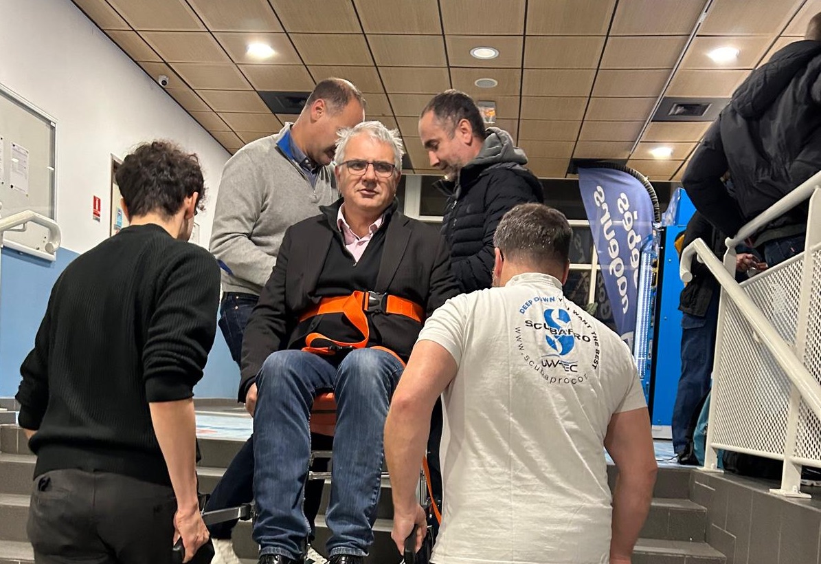 En vue d’accueillir un nouveau plongeur en situation de handicap, l’APP a investi dans une chaise à porteur. Test en condition réelle ce jeudi avant l’entrainement. Merci aux adhérents qui se sont rendus disponibles.